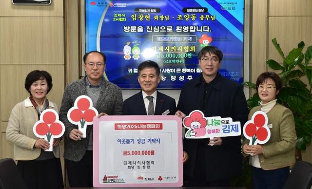 정성주 김제시장은 “어려운 경제 상황 속에서도 지속적인 나눔을 실천해 주신 김제시 의사협회에 깊이 감사드리며, 기탁해 주신 성금은 도움이 필요한 이웃들에게 소중히 전달하겠다.”고 전했다.