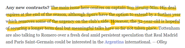이달 초 '더 스탠더드'처럼 토트넘이 다년 계약안을 제시했으나 손흥민이 이를 마음에 들어하지 않아, 토트넘이 울며 겨자먹기로 1년 연장 옵션 활성화 원한다는 분석도 등장하는 중이다.