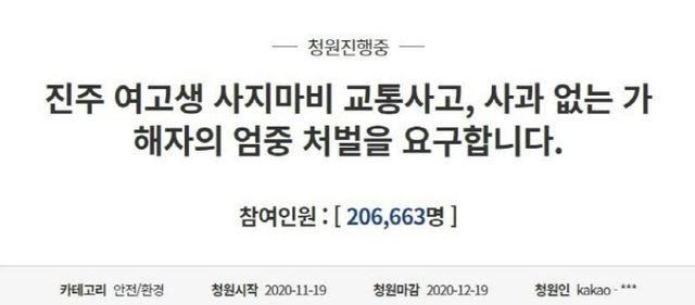 1심 선고 후 피해 학생의 언니는 ‘진주 여고생 사지 마비 교통사고, 사과 없는 가해자의 엄중 처벌’이라는 제목의 청와대 국민청원 글을 올렸다.