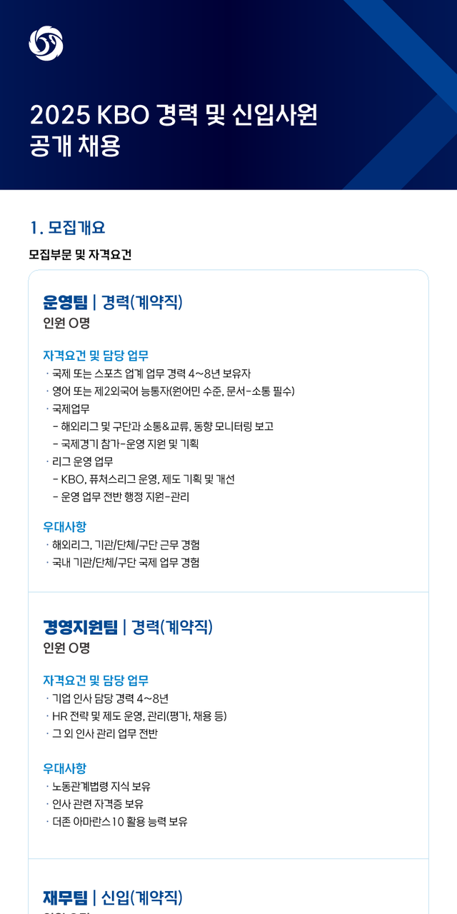 채용될 경우 운영팀은 국제업무 및 KBO리그 운영을 담당하고, 경영지원팀은 HR 전략 및 제도 운영 등 인사관리 전반, 재무팀은 재무·회계·세무 관련 업무 전반을 수행하게 된다.