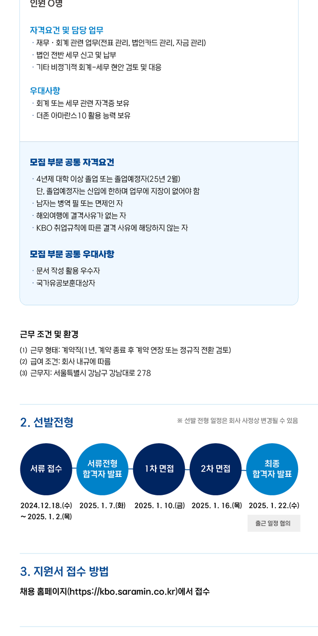 KBO는 운영팀과 경영지원팀 경력사원, 재무팀 신입사원 등 총 3개 분야에서 계약직 채용을 진행한다.