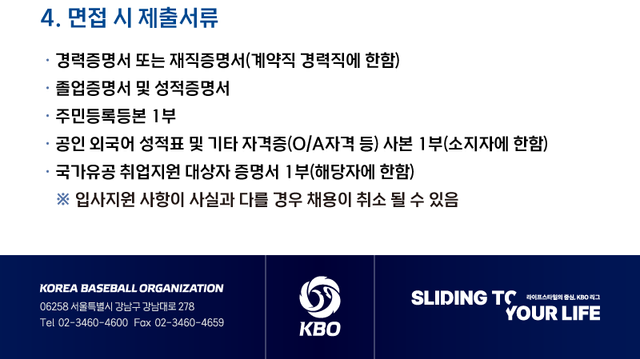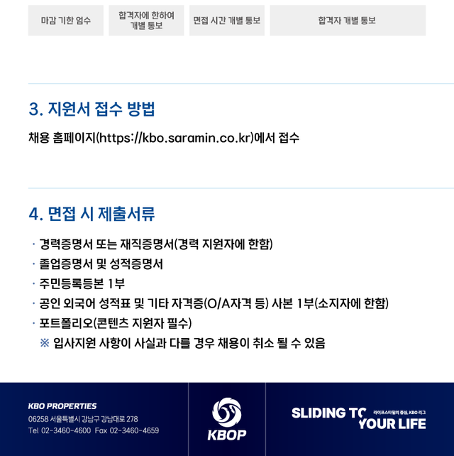 지원서 제출은 KBO & KBOP 채용 홈페이지에서 18일부터 가능하며, 분야별로 마감 기한은 상이하다. 각 채용 형태별 세부 정보 및 우대 사항 등은 채용 공고문을 통해 확인 가능하다.