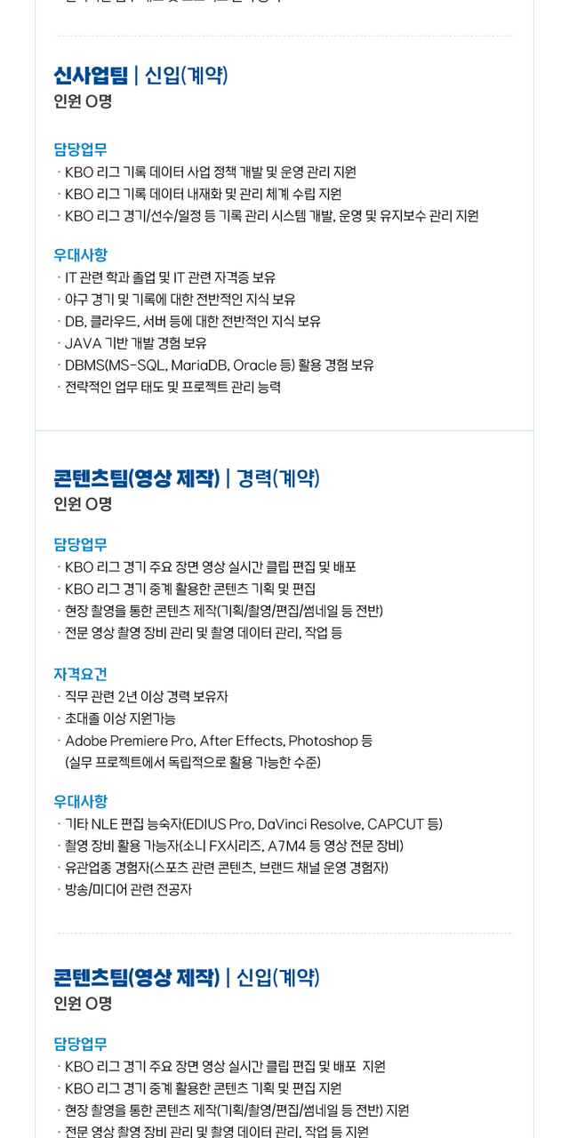마케팅팀 채용자는 기업 파트너십, 콜라보 마케팅, IP 사업 등 B2B 사업 업무를 담당하게 된다. 신사업팀 채용자는 KBO리그 기록 데이터 사업 정책 개발 및 운영 관리, 데이터 내재화 및 관리 체계 수립 등의 업무를 맡게 된다. 콘텐츠팀 채용자는 KBO리그 경기 주요 장면 영상 실시간 클립 편집 및 배포, 현장 촬영을 통한 콘텐츠 제작 등의 업무를 담당하게 된다.