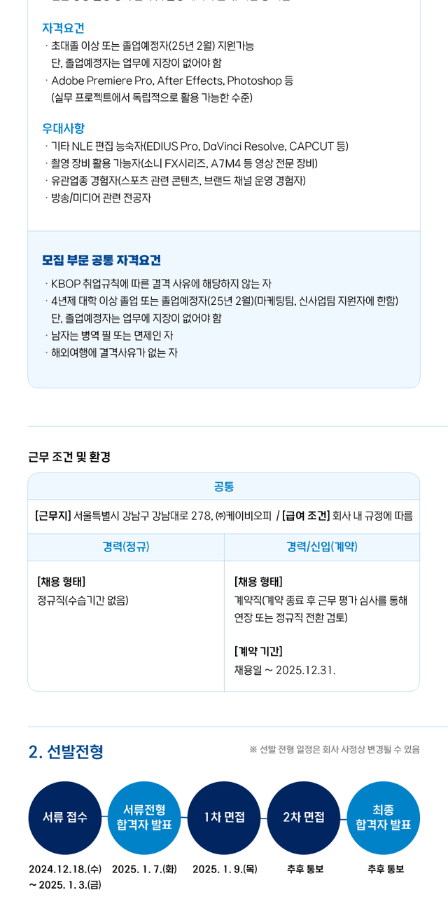 KBOP 채용의 모집부문은 마케팅팀 경력직(계약직) 및 신사업팀 경력직(정규직), 신입사원(계약직), 콘텐츠팀 경력직(계약직), 신입사원(계약직)이다.