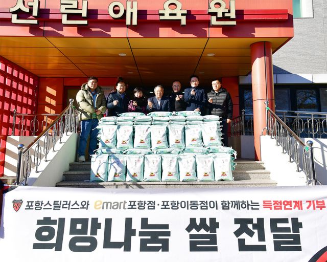 포항 스틸러스는 18일 선린애육원을 방문해 쌀을 전달했다. 전달식에는 포항 스틸러스 임직원과 김광석 이마트 포항점장, 최기영 이마트 포항이동점장이 참석했다. 포항시 편준 복지국장과 포항시청, 이마트 직원들도 함께해 뜻을 나눴다.