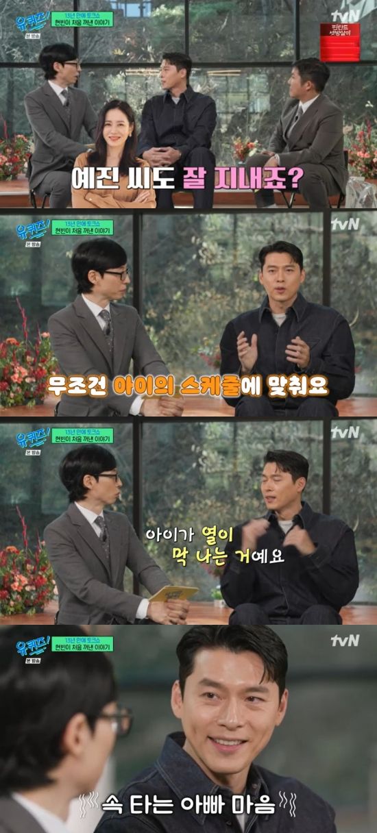 특히 현빈은 근황에 대해 "개인적으로는 운동하고 그리고 아이랑 시간 많이 보낸다. 무조건 아이의 스케줄에 맞추는 거 같다. 오늘도 녹화를 와야 하는데 애가 열이 많은 거다. 그게 계속"라며 털어놨다.