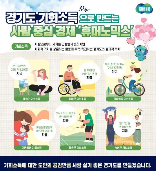 기회소득은 시장으로부터 가치를 인정받지 못하지만 사회적 가치를 창출하는 활동에 주목, 사회의 지속가능성을 확보하는 정책이다. 특히 사회적 가치를 창출하는 활동을 촉진하는 경제적 투자라는 점에서 민선 8기 경기도의 도정 철학인 휴머노믹스(사람중심경제)가 반영된 대표적인 정책으로 꼽힌다.