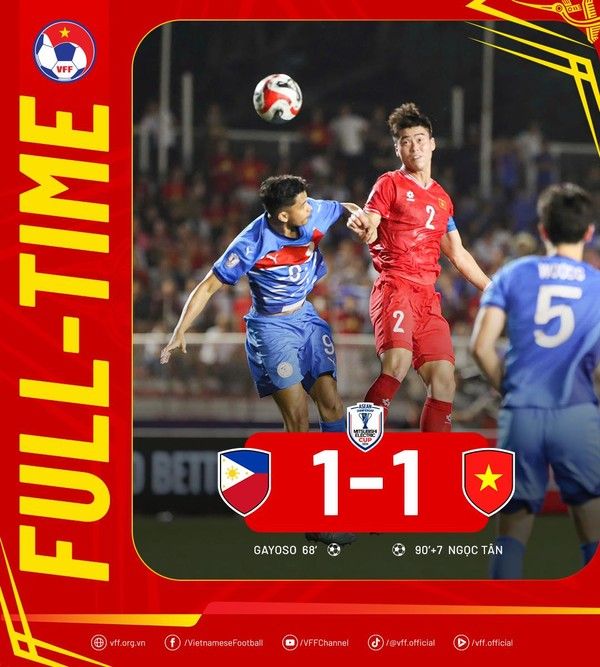 이후 파상공세로 전환한 베트남은 마지막까지 필리핀 골문을 두드렸고, 후반 추가시간 극적인 동점골에 성공했다. 후반 추가시간 7분 코너킥 상황에서 필리핀의 패트릭 데이토 골키퍼가 골문을 비우고 나왔는데 공을 잡지 못하는 치명적인 실책을 했고, 먼 골대로 돌아나가던 도안 응옥 떤이 어려운 상황에서도 머리를 갖다대 골문 안으로 공을 밀어넣었다.