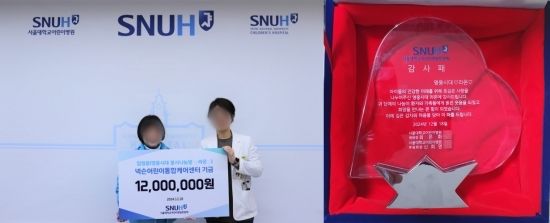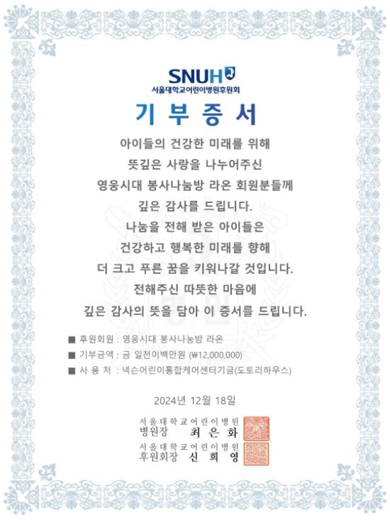 18일 서울대병원은 임영웅 팬클럽 '영웅시대 봉사나눔방 라온'으로부터 넥슨어린이통합케어센터 후원금 1,200만 원을 전달받았다고 밝혔다.
