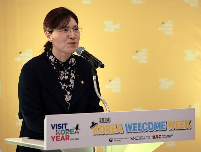 장미란 문화체육관광부 제2차관이 지난 9월 26일 제주공항에서 열린 2024 한국방문의 해 계기 하반기 환영주간 개막식에서 인사말을 하고 있다. / 뉴스1=문화체육관광부