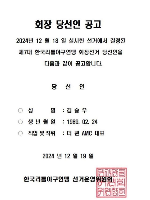 한국리틀야구연맹은 18일 공식 홈페이지 등을 통해 이날 치러진 회장 선거에서 결과를 공고했다. 한국리틀야구연맹은 "더 퀸 AMC 대표인 배우 김승우가 임기 4년 회장에 당선됐다고"고 전했다.