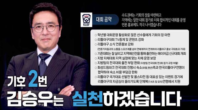 김승우는 이번 선거에서 여러 현실적인 공약을 내세워 눈길을 끌었다. 그는 리틀야구 선수들이 중학교 1학년 시기 이중 등록 문제로 겪는 불편을 해결하겠다고 약속했다. 또 미국, 일본, 대만 등과 국제 교류전을 확대해 리틀야구 선수들에게 글로벌 경험을 제공하겠다고 밝혔다. 여기에 재정 개선과 행정 제도 정비를 통해 연맹의 지속 가능성을 높이는 것도 주요 과제로 제시했다.