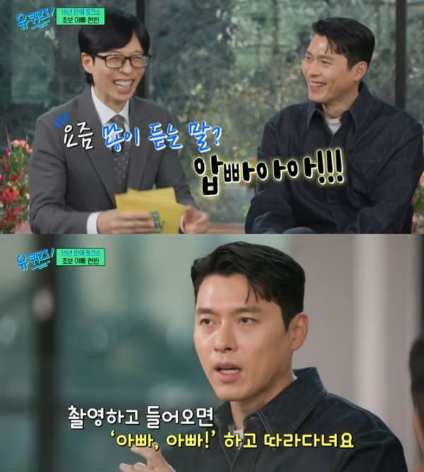 이날 방송에서 현빈은 "운동하고 아이랑 시간을 많이 보낸다"는 근황을 전했습니다. 그는 "무조건 아이 스케줄에 맞춘다. 오늘도 녹화하러 와야 하는데 아이가 막 열이 나는 거다. 그게 신경 쓰인다"고 말해 눈길을 끌었습니다.