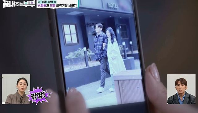 전달받은 한 장의 사진에는 여자 회원과 다정하게 커피를 마시고 팔짱을 낀 채 모텔에서 나오는 두 사람의 모습이 담겨 있었다.