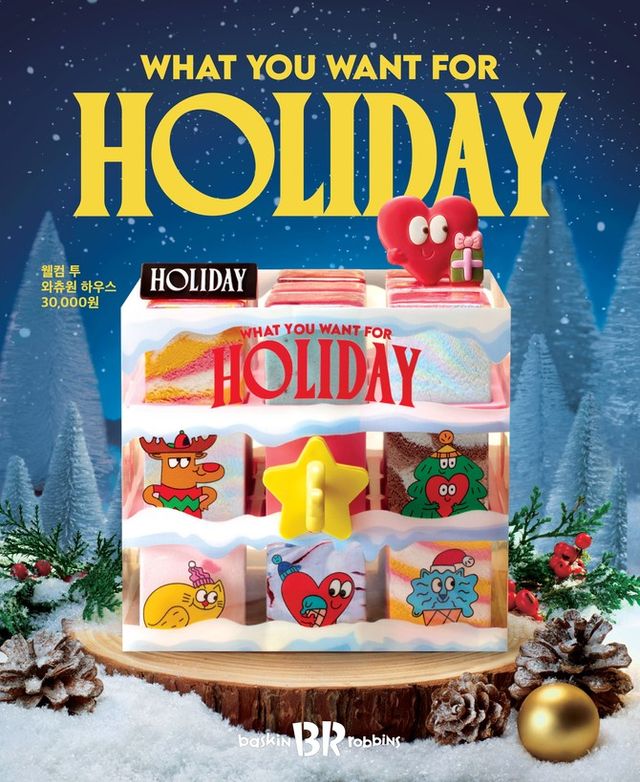 배스킨라빈스는 다양한 맛과 독특한 디자인으로 구성된 '와츄원 포 홀리데이' 테마의 2024 크리스마스 케이크 17종을 출시했다. 대표 제품은 △별 모양 열쇠를 돌리면 초코볼과 아이스크림이 등장하는 '웰컴 투 와츄원 하우스' △기차를 당기면 캔들이 나타나는 '스윗 트레인 와츄원 타운'이다. 이외에도 '파티 와츄원', '딥핑 카라멜 퐁듀 와츄원' 등 색다른 와츄원 케이크와 '포차코의 러블리 윈터' 같은 캐릭터 케이크도 만나볼 수 있다.