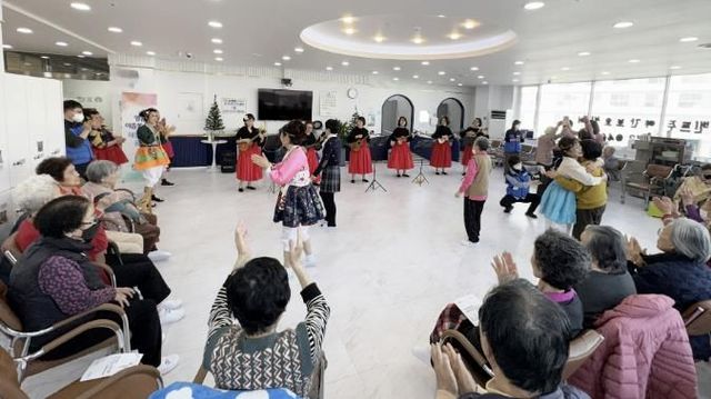 이날 공연에는 매탄2동의 ‘아리아앙상블(우쿨렐레)’팀과 영통3동의 ‘꾼 예술단(장구난타)’팀이 참여하여 다채롭고 흥겨운 무대를 선보였으며 어르신들은 공연 내내 열띤 박수와 함박웃음으로 봉사단의 공연에 화답했다.