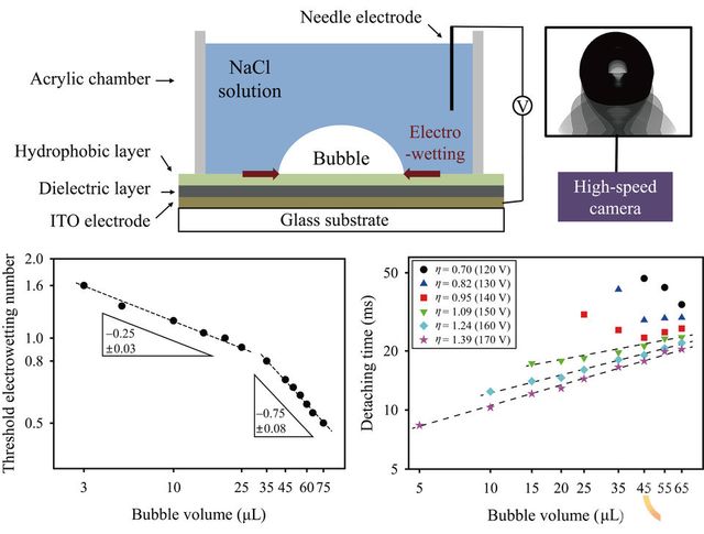 홍 교수 연구팀은 전기력을 이용해 유체의 젖음성(wettability)을 제어하는 전기습윤(electrowetting) 기술을 적용, 다양한 크기의 기포를 소수성 표면으로부터 효과적으로 제거할 수 있는 방법을 제시했다. 연구팀은 실험과 이론 분석을 통해 △기포의 부피 △임계 제거 전압 △제거 시간 간의 상관관계를 도출하고, 미세유체시스템에서 기포 제거를 위한 최적화된 설계 방향을 제안했다.