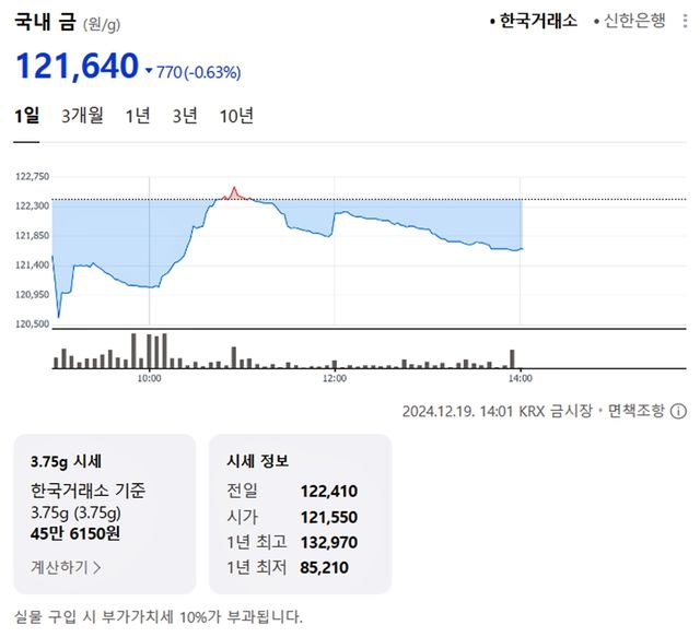 국내 금시세(금값)가 19일 오후 하락세(전 거래일 대비)를 보이고 있다.