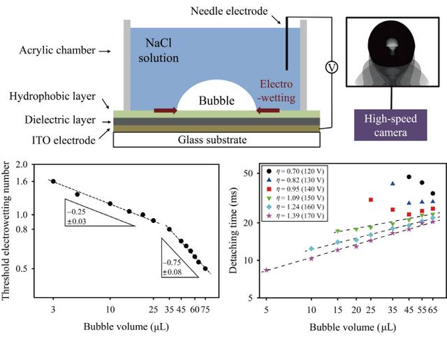 홍 교수팀은 전기력을 이용해 유체의 젖음성(wettability)을 제어하는 전기습윤(electrowetting) 기술을 적용, 다양한 크기의 기포를 소수성 표면으로부터 효과적으로 제거할 수 있는 방법을 제시했다. 연구팀은 실험과 이론 분석을 통해 △기포의 부피 △임계 제거 전압 △제거 시간 간의 상관관계를 도출하고, 미세유체시스템에서 기포 제거를 위한 최적화된 설계 방향을 제안했다.