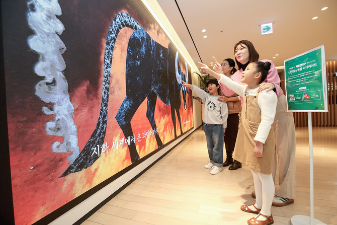 KT 광화문 EAST 사옥에서 열리는 미디어전시 'AI 상상동화'를 감상하는 어린이들 모습. ⓒ KT