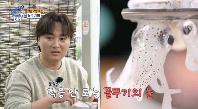 황제성은 “꼴뚜기가 눈을 너무 뜨고 있는데 괜찮나요? 얼핏 봐도 스무 개의 눈이 저를 쳐다보고 있다”라며 주저하는 모습을 보인다. 이에 김준현과 문세윤은 “입에 넣어봐. 예술이다”라고 부추긴다.