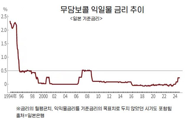 일본 중앙은행인 일본은행(BOJ)은 19일까지 이틀간 진행한 금융정책결정회의에서 기준금리인 무담보 콜 익일물 금리 유도 목표치를 조정하지 않고 0.25%로 유지하기로 했다. 같은 날 대만과 영국 등도 모두 금리 동결에 나섰다. 대만은 기준금리를 2%로, 올해 두 차례 0.25%포인트를 인하했던 영국은 4.75% 기준금리를 유지한다.