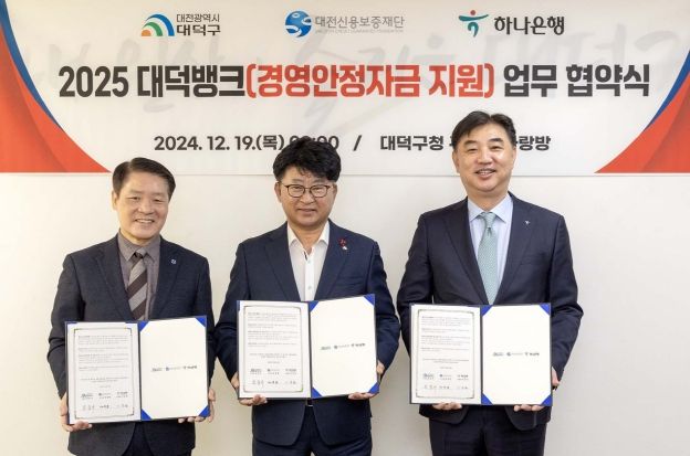 대덕구는 2025년 ‘대덕뱅크’ 사업 추진을 위해 대전신용보증재단, 하나은행과 3자 업무협약을 체결했다고 19일 밝혔다.