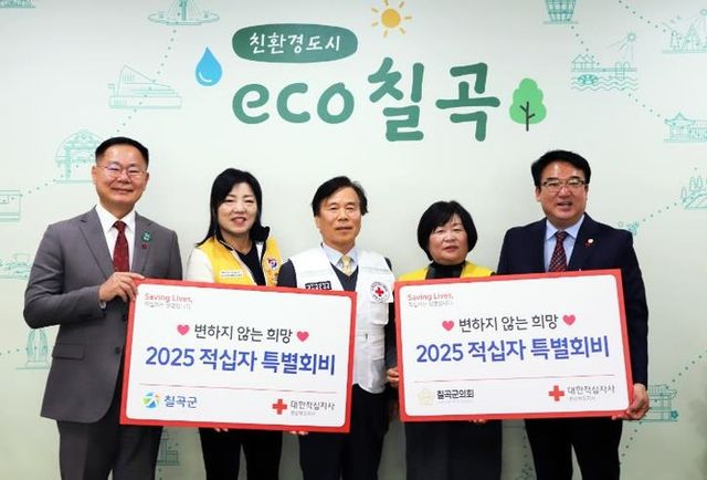 [파이낸셜경제=김예빈 기자] 칠곡군과 칠곡군의회는 12월 18일 군수실에서 김재욱 군수와 이상승 군의회 의장 등이 참여한 가운데 2025년도 적십자 특별회비 전달식을 가졌다.