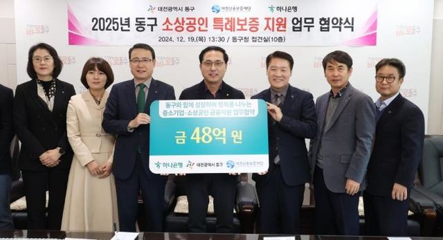 대전 동구는 19일 구청장 집무실에서 대전신용보증재단, 하나은행 충청영업그룹과 ‘소상공인 경영안정 자금 특례 보증지원’을 위한 업무협약을 체결했다고 밝혔다.