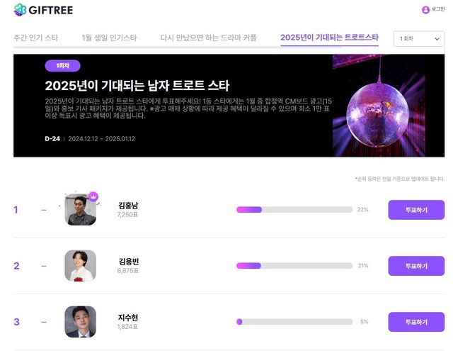 이와 관련해 트로트 스타들로만 구성된 팬 투표도 주목받고 있다. 팬 투표 서비스 기프트리는 '2025년 기대되는 트로트 스타' 투표를 진행 중이다. 12월 12일부터 1월 12일까지 진행되는 이번 투표에는 남자 트로트 스타들이 후보로 올라 있다.