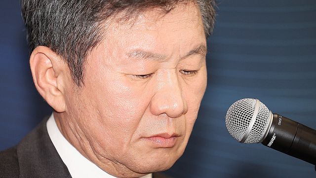 정몽규 대한축구협회장이 19일 오후 서울 종로구 포니정재단빌딩에서 열린 선거 출마 기자회견에서 취재진 질문을 듣고 있다. / 연합뉴스