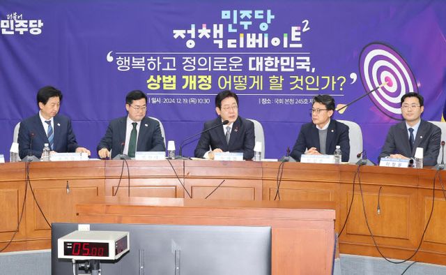 민주당은 19일 오전 국회 본청에서 이 대표가 좌장을 맡은 가운데 상법 개정안 정책 토론을 진행했다. 경영진 측은 박일준 대한상공회의소 상근부회장, 이형희 SK수펙스 커뮤니케이션위원장, 김동욱 현대차 부사장, 최승재 세종대 교수 등이 참석했다. 투자자 측 토론자로는 명한석 참여연대 실행위원, 윤태준 주주행동 플랫폼 액트 연구소장, 박광현 두산에너빌리티 소액주주 대표 등이 자리했다.