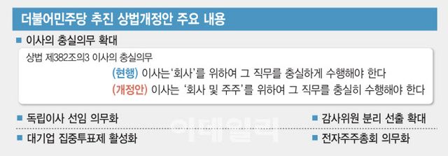 민주당이 주도하고 있는 상법 개정안은 ‘이사의 충실 의무’를 회사뿐 아니라 주주 전체로 확대하는 내용 등이 담겨, 통과될 경우 우리나라 기업 환경을 송두리째 바꿀 것이란 예상이 나온다.