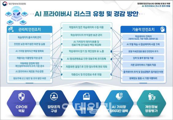 개인정보보호위원회는 ‘안전한 인공지능·데이터 활용을 위한 AI 프라이버시 리스크 관리 모델’을 19일 공개했다. 리스크 관리 모델에는 AI 생애주기에 걸친 프라이버시 리스크 관리의 △방향과 원칙 △리스크 유형 △경감 방안을 체계적으로 담았다.