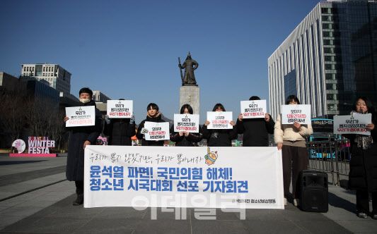 윤석열퇴진 청소년비상행동(청소년비상행동)은 19일 서울 광화문 이순신 동상 앞에서 기자회견을 열고 “‘12·3 비상계엄 사태’는 우리가 역사책에서 배운 대로 국민들의 자유와 권리, 민주주의를 위협하는 존재였고, 일상을 빼앗았다”고 주장했다.