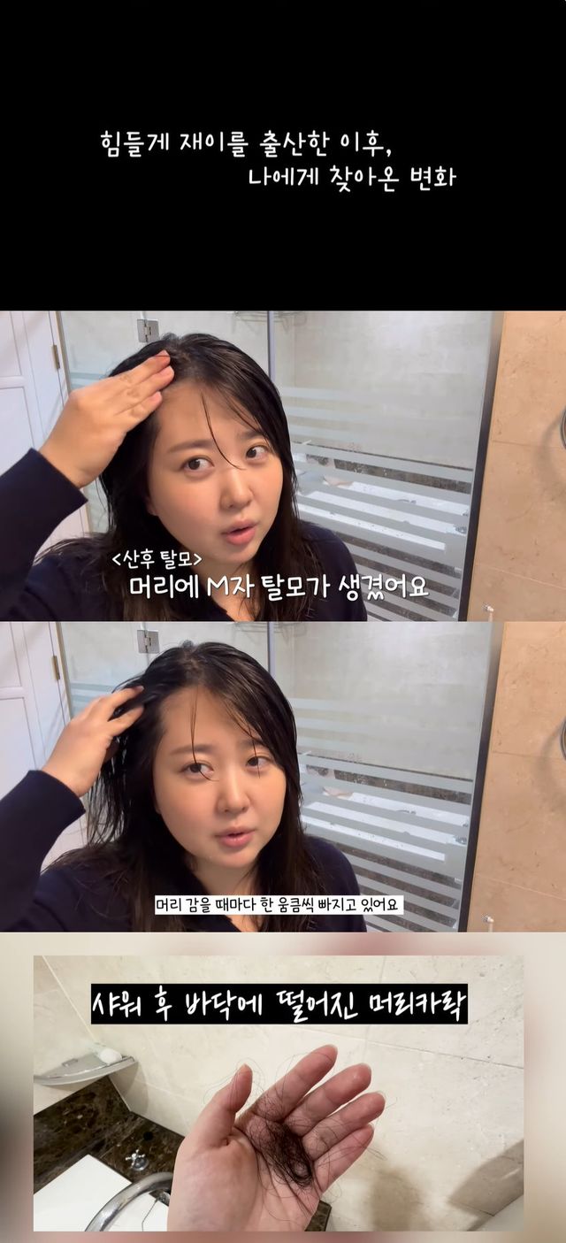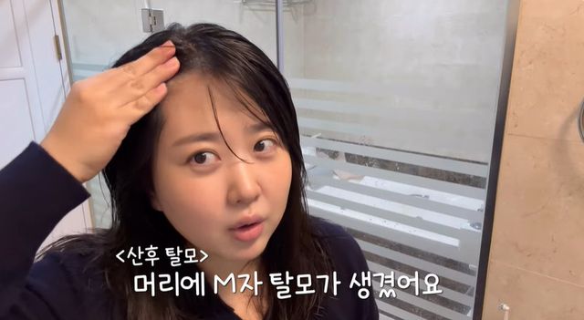 화장실 거울 앞에서 김다예는 "지금 여기 머리에 M자 탈모 식으로 숱이 빠진다"며 "머리 감을 때마다 한 움큼씩 빠지고 있다"고 샤워 후 바닥에 떨어진 머리카락을 직접 보여주며 산후 탈모에 대한 고충을 토로했다.