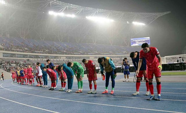 10월 15일 오후 경기 용인시 처인구 용인미르스타디움에서 열린 2026 국제축구연맹(FIFA) 북중미 월드컵 아시아 3차 예선 B조 4차전 대한민국과 이라크의 경기에서 이라크에 3대 2 승리를 거둔 대한민국 선수들이 팬들에게 인사하고 있다. / 뉴스1