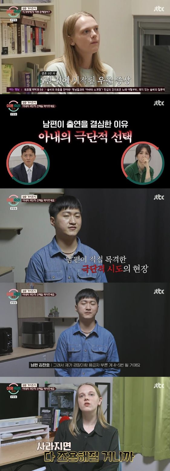 그 뒤로도 비슷한 사건이 많았다는 남편. 아내는 "10번 정도 된다. 사라지면 조용해지니까. 아픔, 걱정도 아무 것도 없을 것이니까"라며 깊은 우울증 증상을 보였다.