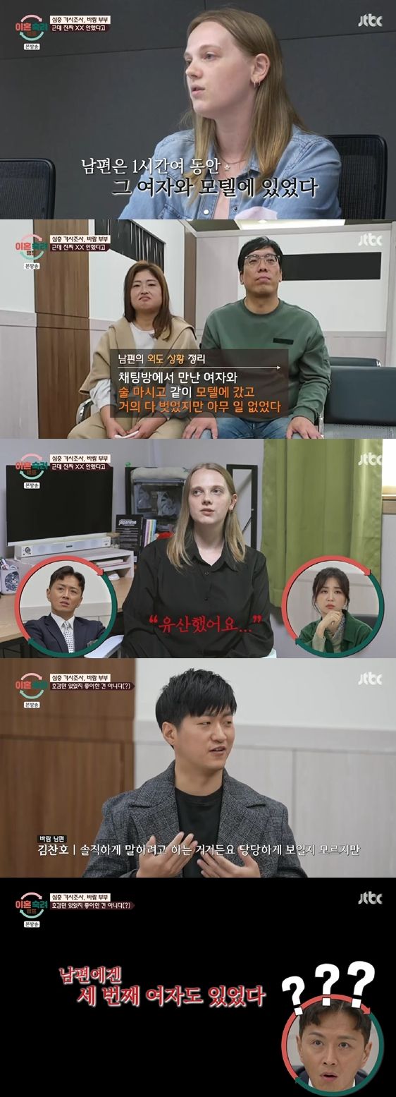 세 번째 여자도 있었다는 바람 남편은 "고등학교 때 짝사랑하던 누나가 메신저만 하다가 나중에 전화를 걸더라"라고 인정했다. 아내는 "새벽에 전화가 잦았다"고 이야기했고 남편은 "그냥 안부를 물은 것일 뿐"이라고 변명했다.
