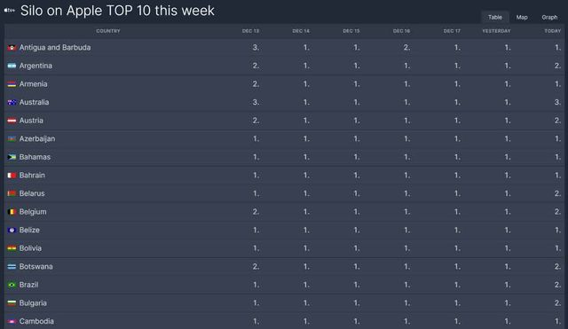 20일 플릭스패트롤과 로튼토마토에 따르면 '지하창고 사일로의 비밀'은 토마토 지수 96%, 팝콘 지수 61%를 기록하며 앤티가바부다, 아르메니아, 아제르바이잔, 바하마, 바레인, 벨리즈, 볼리비아, 캄보디아, 카보베르데, 콜롬비아, 도미니카, 도미니카 공화국, 이집트, 피지, 가나, 그레나다, 과테말라, 온두라스, 홍콩, 인도네시아 공화국, 일본, 요르단, 라오스, 레바논, 말레이시아, 멕시코, 몽골리아, 모잠비크, 나미비아, 니제르, 오만, 파나마, 페루, 필리핀 제도, 카타르, 살바도르, 사우디 아라비아, 스리랑카, 대만, 타지키스탄, 태국, 우간다, 아랍에미리트, 베트남 등 45개국의 'Apple TOP 10' 부문 1위에 올랐다.