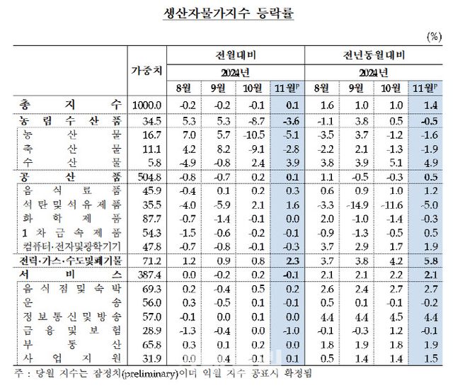 농림수산품을 제외한 다른 품목은 모두 올랐다. 공산품은 0.1% 올랐는데, 석탄 및 석유제품이 1.6%, 음식료품은 0.1% 각각 상승했다. 전력·가스·수도 및 폐기물은 산업용 전력(7.5%)과 증기(0.1%) 등이 올라 전월대비 2.3% 상승했다. 서비스의 경우 금융 및 보험서비스(-1.0%)와 운송서비스(-0.1%) 등이 내려 전월대비 0.1% 하락했다.
