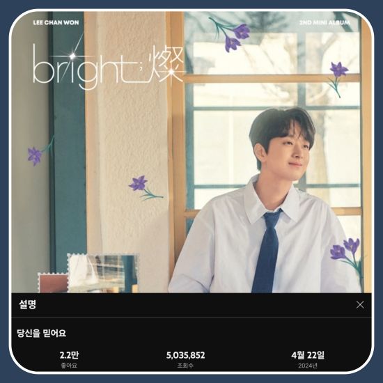 지난 4월 이찬원의 공식 유튜브 채널인 '또튜브'에 게재된 '당신을 믿어요' 음원 영상이 조회수 400만 스트리밍을 넘어섰다.