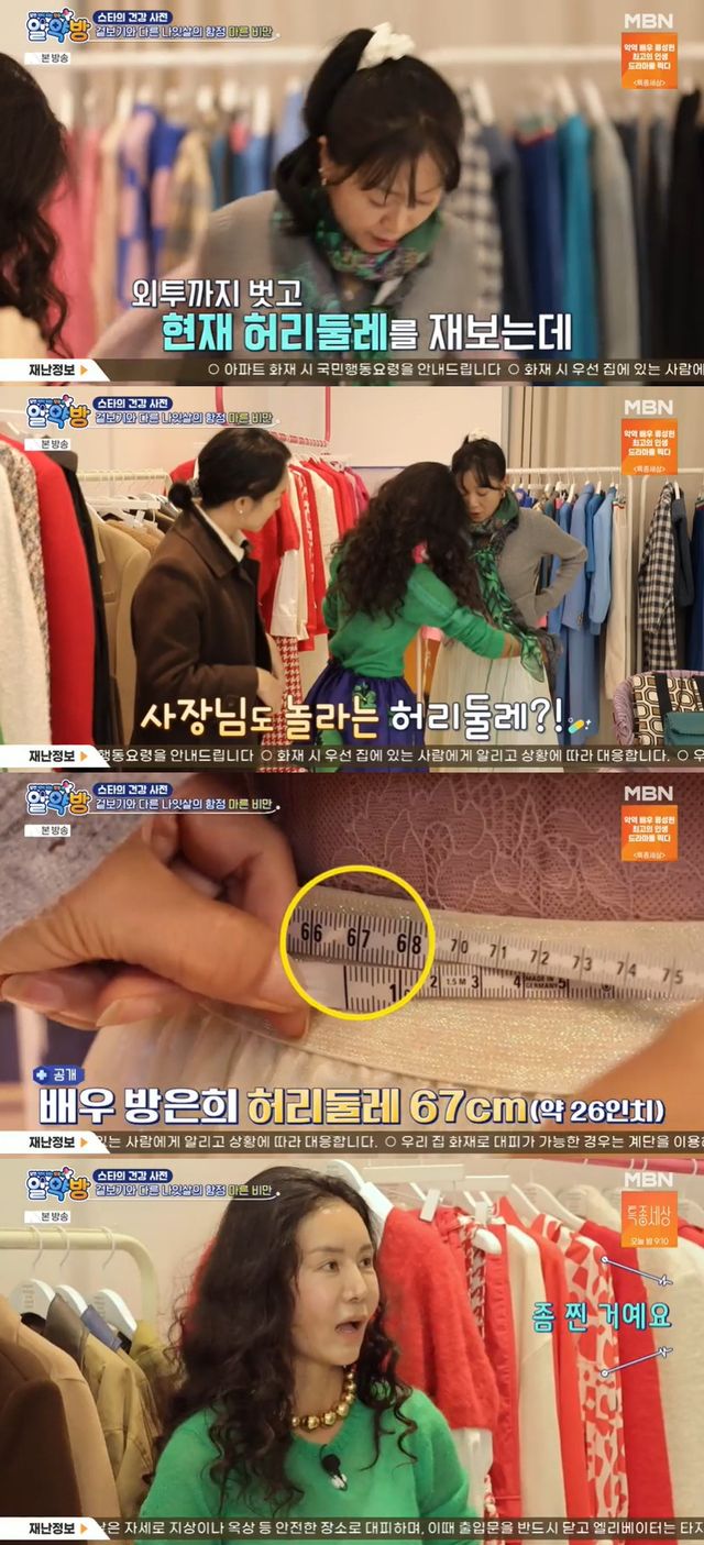 외투까지 벗고 허리둘레를 재보던 방은희는 무려 26인치의 개미 허리를 자랑하더니 "(살이) 좀 쪘다"고 망언을 던졌다.