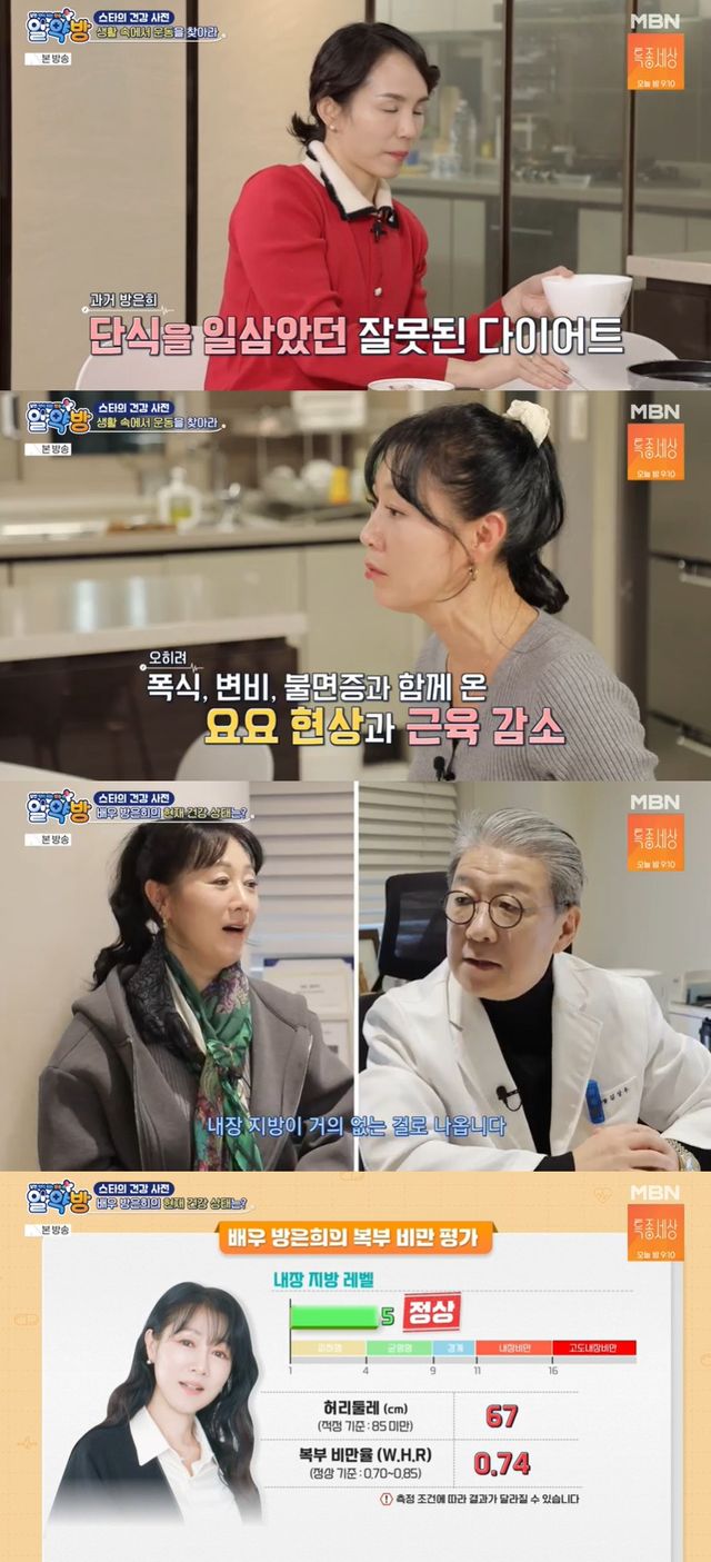 19일 방송된 MBN '알면 약이 되는 방송'(이하 '알약방')에는 배우 방은희가 과거 출산 후 늘어난 체중과 나잇살 고민에서 벗어날 수 있었던 방법을 밝히는 모습이 전파를 탔다.