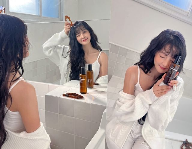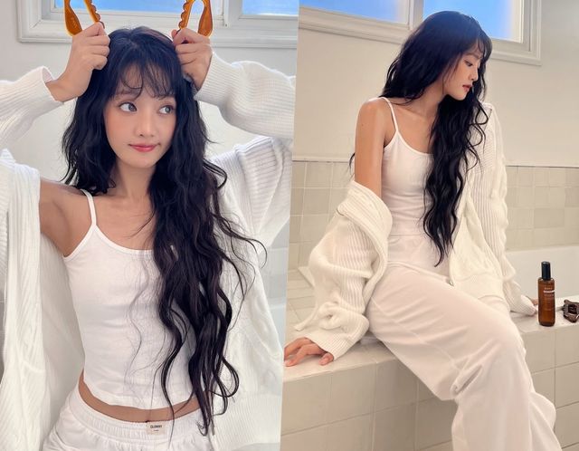사진 속 민니는 화이트 민소매 티에 루즈한 바지를 입고 가디건을 매칭한 깨끗한 모습이다. 해당 모습으로 민니는 괄사 등을 이용해 피부를 관리하는 모습으로 눈길을 끈다.