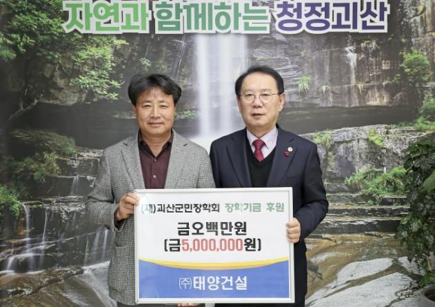 19일 ㈜태양건설 정승진 대표는 괴산군청을 방문해 괴산군민장학기금 500만 원을 기탁했다.