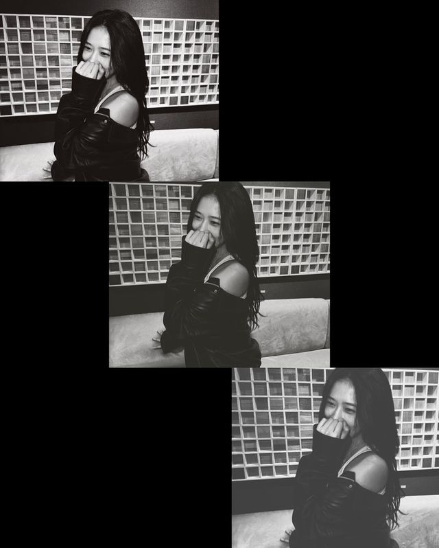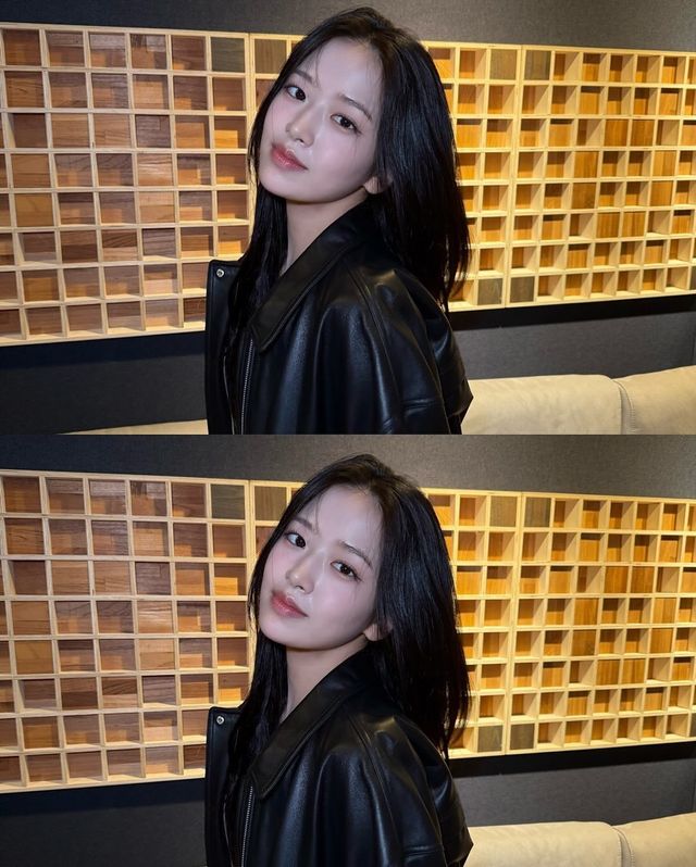 안유진은 강렬한 블랙 가죽 재킷에 민소매 화이트 이너를 매칭해 쿨하면서도 강한 매력을 보였다. 하지만 웃으면 바로 '댕댕이(강아지)'같은 매력을 발산해 보는 이들을 감탄케 한다.