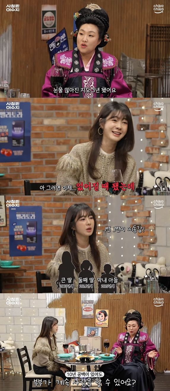 이수지는 "부부가 계속 사랑을 할 수 있냐. 첫째 낳고 10년 후에도 부부가 사랑이 되냐"라며 신기해했다.