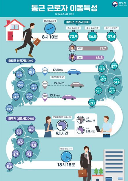 출퇴근 소요시간은 남성이 여성보다 9분 더 썼고, 30대가 76.9분으로 가장 길며 연령이 높을수록 짧은 경향을 보였다. 이동거리는 남성이 여성보다 5.9㎞ 더 멀리 이동했고 수도권에 사는 40대의 이동거리가 18.6km로 가장 길었고 제주도 거주 60대 이상은 15.2km로 가장 짧았다.