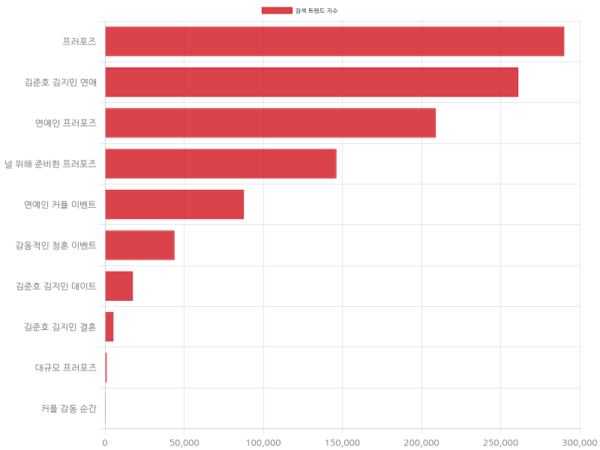 '프러포즈'라는 키워드는 검색 트렌드 지수 290,000 포인트로 가장 높은 순위를 기록했다. 이는 김준호와 김지민의 프러포즈 현장이 대중에게 얼마나 큰 주목을 받고 있는지를 잘 보여준다. PMI 지수 4,500 포인트와 소셜 트렌드 지수 5,800 포인트 또한 이 키워드에 대한 대중적 관심이 상당히 높음을 나타낸다.